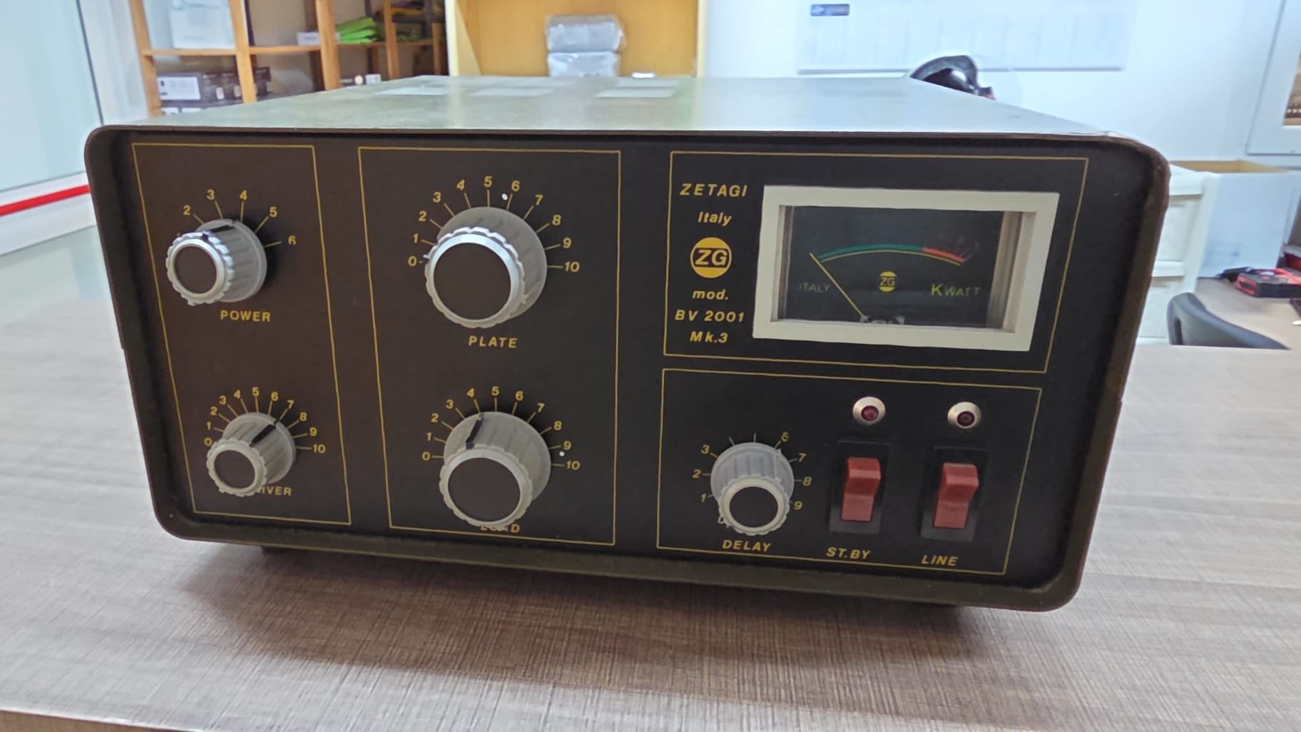 Amplificatore lineare zetagi BV2001 MK3 (quello con ritardo di sgancio portante ssb regolabile) per banda 11 metri. 4 valvole, una in primo studio di amplificazione e 3 in stadio finale, 500w di uscita reali.