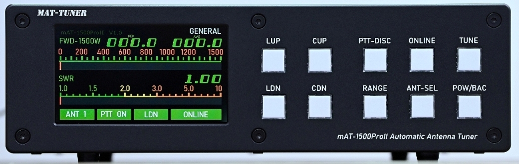 The mAT-1500ProII is a multipurpose high-power automatic antenna tuner that can match almost all transmitters and linear amplifiers. The maximum RF power allowed is 1500 watts (SSB), the frequency range allowed is 1.8-30MHz, and two antennas can be connected at the same time. According to the different connected transmitters, the tuner has three modes, YAESU, ICOM and GENERAL. The tuner can automatically determine and match the type of the connected transmitters to minimize the manual operation.