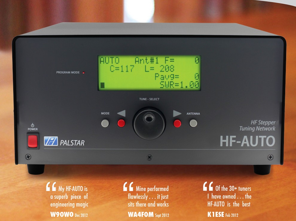 La HF -Auto fornisce tre uscite antenna arbitrari selezionati manualmente o automaticamente a seconda della frequenza . In alternativa, il tuner può essere commutato in modalità " bypass" per disattivarla . Una volta che si trovano le impostazioni per buona SWR possono essere salvate automaticamente , il che rende l'ottimizzazione prossima volta ancora più veloce . L'interfaccia seriale viene utilizzata per aggiornare il firmware , un cavo seriale incluso . Palstar prevede di lanciare una versione telecomandata di questo sintonizzatore , però una data di uscita non è ancora disponibile . Richiede alimentazione 12V , un cavo DC con un connettore per il sintonizzatore è inclusa.