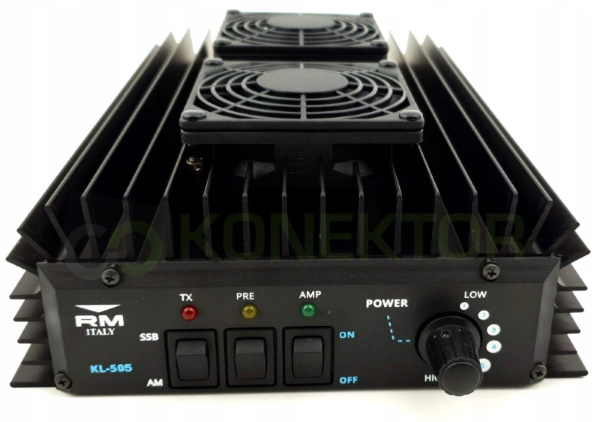 RM ITALY - KL505V - *** NUOVO MODELLO *** AMPLIFICATORE HF A LARGA BANDA -- CON VENTOLA DI RAFFREDDAMENTO PER MIGLIORE EFFICIENZA -CARATTERISTICHE TECNICHEAlimentazione: 13.8 VDC +/- 1VAlimentatore suggerito per ciclo gravoso: 50A Frequenza operativa: 25-30 MHz - Banda radioamatoriale 10 metri - Utilizzabile 1.8-30 MHz aggiungendo filtro passa-basso per evitare armonicheCorrente massima assorbita: 35APotenza d'ingresso: 1-10 WATT (in tutti i modi operativi)Potenza in uscita: 230 WATT MAX in CW/FM Transistor impiegati: 4 x RM SD1446Massima potenza di bypass (amplificatore spento): 50 Watt Modi operativi: AM-FM-SSB-CW-SSTV-RTTY-Modi digitali Fusibili: 3 × 12AR.O.S. max. in ingresso: 1.1-1.5:1R.O.S. massimo in uscita: 2.5:1Armoniche in uscita: >-50 dBc @25-30 MHzLivelli potenza in uscita: 6 (mediante attenuatore d'entrata)Preamplificatore di ricezione: 26 dBDimensioni: 190 x 270 x 65 mmPeso: circa 2 kg