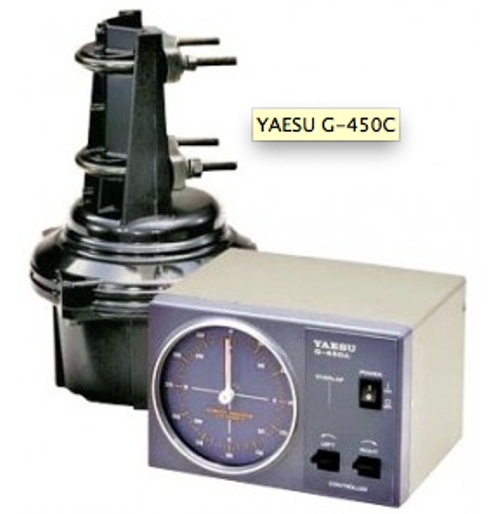 Rotore di antenna G-450 A.Questa linea di rotori d'antenna per radioamatori ed installatori è frutto di una notevole esperienza nella progettazione e costruzione sin qui acquisita dalla YAESUCon i suoi differenti 8 modelli di rotori e controlli remoti permette di assecondare le più varie esigenze di supporto per antenne.Infatti la vasta gamma di modelli permette di scegliere il giusto rotore per antenne televisive, antenne VHF/UHF, antenne per comunicazioni satellitari sino alle grandi antenne direttive per le bande HF sia di tipo tribanda che monobanda. L'unità motore è inserita in una custodia in alluminio pressofuso resistente all'acqua e protetta con particolari trattamenti dalle intemperie. Le parti meccaniche sono lubrificate in fabbrica e non abbisognano di manutenzione anche in presenzadi avverse condizioni climatiche.Esse sono fornite di freno automatico o manuale. Il controllo remoto è dotato di strumenti analogici rettangolari o circolari per l'indicazione di direzione aziMutale.Di particolare interesse per i radioamatori appassionati di collegamenti via satellite sono i modelli che offrono sia la rotazione azimutale che l'elevazione da 0 a 180°